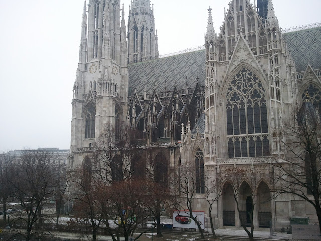 Eilen lensimme Itävaltaan Wieniin. Helsinki – Vantaan kentällä meinasi pinna palaa, kun lähtöselvityksessä oli paljon ja pitkään ongelmia henkilöstön tietokoneiden kanssa. Konekin lähti yllätys yllätys myöhässä. No, perille kuitenkin päästiin ja loma alkoi heti koneesta laskeutuessa oikein mukavasti. Wienissä meitä odotti meidän talouteen suhteellisen hinnakas, mutta todella upea hotelli. Hotellissa pystyi kuvittelemaan itsensä entiseen Itävalta – Unkarin ja keisarinna Sissin aikaan. Tänään aamu alkoi loistavalla aamiaisella. Katukuvassa ei juuri nähnyt lunta, mutta pakkasta oli mukavasti -3 – -5 astetta. Aamiaisen jälkeen lähdimme yhdessä ulos katselemaan Wienin kultturellia kaupunkia ja tekemään pikku ostoksia. Aivan hotellimme vieressä oli kaunis kirkko, joka näkyi hotellihuoneemme ikkunasyvennyksessä istuessa. Päätimme käydä tutustumassa kirkkoon lähemmin. Kirkko paljastui Votive – kirkoksi, jossa oli upeat holvikaaret, kauniita ikonimaalauksia ja patsaita ja torneja. Kirkko oli todella upea, mutta siellä ei ollut minkäänlaista lämmitystä, vaan pakkasta oli varmasti yhtä paljon kuin ulkonakin. Rauno valitteli, kun miehet eivät saa olla kirkossa hattu päässä ja niin lähdimme “sään pakottamana” ulos tästä sielun majasta =)