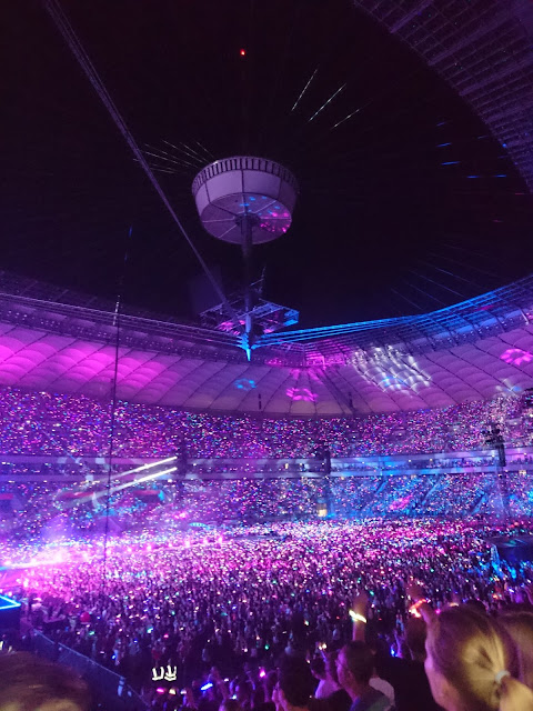 Taksi oli tilattu jo etukäteen kuudeksi ja siellähän se pihalla meitä jo odotteli. Hieman väärän rakennuksen kohdalla tosin, mutta paikalla kumminkin. Oli aika jännittävä ja odottava tunnelma. Taksi jätti meidän stadionin eteen ja lähdimme kiertämään valtavaa ympyrän muotoista rakennusta oikealle portille. Mutta portilla!! Innoissamme kävelimme portille, jossa virkailija sanoi, että lippumme olivat jo valmiiksi käytetyt! Mitä h***toa! Eikun jonottamaan parikyt minsaa kojulle, jossa meille kerrottiin vivagon, josta lippumme oli ostettu, olleen laiton yritys, joka kopioi lippuja ja myy niitä moneen kertaan. Luukun nainen pahoitteli tilannetta ja väitti konserttia loppuunmyydyksi. Kyllä oli sana jos toinenkin kielenpäällä, mutta ei vielä hellitetty. Sisälle oli nyt päästävä hinnalla millä hyvänsä. Olisi muuten liian karvas pettymys. Vieressä oli ticetmastersin koju, jossa jonotti kymmeniä ihmisiä. Sitähän sitä oli yritettävä. Jonotimme n.40min luukulla, jossa kuulimme, että lippuja vapautui koko ajan myyntiin, sillä feikkilippuja on oli ollut niin paljon myynnistä. Lopulta saimme uudet liput (90€/kpl)!! Luoja kun tärisytti..nyt oli viimestään elämä ihan sekasin. Päästiin jatkamaa stadionin kiertämistä lähes alkupisteeseen, ennen kuin pääsimme uudelle portillemme. Ei osannu huokaista, ennen kuin olimme päässeet uusilla lipuilla alueelle. Pääsimme vierekkäisille paikoille aivan esiintymislavan sivuun. Muutaman rivin edempää olisi lavan nähnyt vielä aivan toisella tavalla, mutta tästäkin näimme erinomaisesti. Kiitos sisäänpääsystämme kuuluu täysin järjestäjälle, sillä lippuhuijausten vuoksi stadionilta vapautettiin lavan molemmilta sivuilta ainakin nelisen sataa ylimääräistä paikkaa vähä vähältä lisää. Loppupeleissä paikkamme olivat varsin kivat, sillä saimme muutaman vieressä olevan tyhjän paikan turvin seista ja pomppia väljästi ja vapaasti paikoillamme. Ja itse keikka! Kerkesimme kuulla jokusen kappaleen lämppäriartistia Toveloa, joka jo itsessäänkin olisi ollut lipun oston värtti. Ja Coldplayn aloittaessa oli jo niin fiiliksissä, ettei tiennyt olisiko katsonut, tanssinut vai kuvannau, vai tehnyt niitä yhtä aikaa. Koskaan aiemmin emme olleet olleet niin valtavalla keikalla! Stadionilla olimme me ja 90 000 muuta nauttimassa uskomattomasta showsta ja aina yhtä tunnelmallisesta musisointia. Aivan käsittämätön kokemus! Keikan tunnelman täydellistivät jokaiselle ranteeseen jaetut rannekkeet, jotka vilkkuivat ja loistivat esityksen mukaan (tosin Niinan ranneke ei toiminu). Ei tuollaista kokemusta voi oikein sanoin tai kuvin kuvata, jotain niin uniikkia se oli. Coldplay esiintyi kolmella eri lavalla ja päälavan molemmilla reunoilla olleet valtavat näytöt takasivat, että kaikki yleisöstä näkivät esityksen ja saivat valtavan elämyksen. Keikan huippuhetkiä olivat ehdottomasti yleisöön laskettu ilmapallomeri, Viva la vida, sekä hetki, kun stadioni pimeni täysin ja saimme kuunnella esitystä pimeydessä sen siirtyessä salaa kolmannelle pienelle “piilolavalle” stadionin toiseen päätyyn. Keikka kesti kokonaiset kaksi tuntia ja sinä aikana sai itsensä hurmostilaan esityksestä sekä pohkeensa maitohapoille pomppimisesta ja tanssimisesta. Keikan jälkeen suuntasimme väkijoukon mukana kävelemään kohti hostellia. Iltapalaa ostaessa ihailimme vielä hetken vanhan kaupungin aukiolta stadionia, jonka ulkoseinässä kiersi valtavin valokirjaimin Coldpay nimi. Sitten vain unta palloon. Seuraavana päivänä on tiedossa aamupakkaukset, siirtyminen bussilla lentokentälle, sekä paikallisen “visenttipontikan” ostaminen kullalle kotiin viemisiksi.
