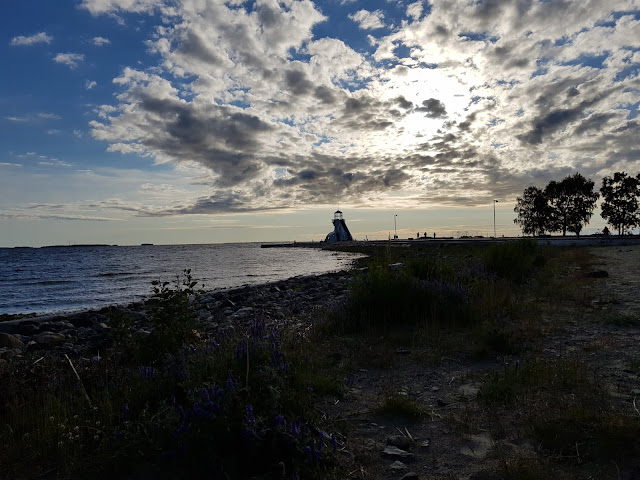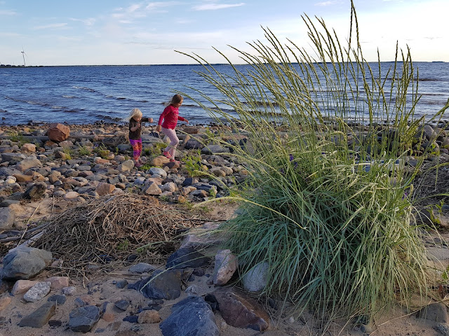 Yöksi ajelimme Nallikarin leirintäalueelle Pohjanlahden rannalle. Teltan kasaus kävi kahdelta hengeltä sukkelaan, kun tytöt viihdyttivät itseään leikkiksellä. Pakko sanoa että loistava leirintäalue on kyseessä. Upealla paikalla ja hyvässä kunnossa pidetty. Huoltokatoksia oli vvain jostain syystä yksi ainokainen käytössä, mikä aiheutti aika pitkiä vessamatkoja teltalta käsin. Iltaruoan jälkeen kävelimme katsomaan, miltä merenrannalla näyttää. Kertakaikkiaan upea hiekkaranta, rauhoittava meri saarinäkymineen ja etempänä näkyvine purjeveneineen ja hieno majakan näköinen näköala/tähystyspaikka merelle. Kiipesimme ylös katselemaan maisemia. Tytöt leikkivät hiekalla ja kuvailivat puhelimillaan onnellisina. Ihanaa olla lomalla! Illalla teltassa lueskeltiin vielä kirjoja ja tehtiin oppi ja ilo kortteja. Huomenna hervottoman pitkä ajomatka edessä, mutta ei haittaa. Niin paljon hienoa nähtävää luvassa!