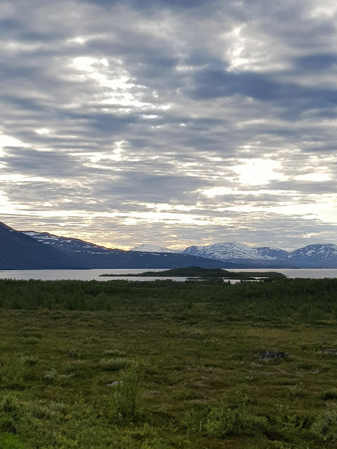 Abiskossa saimme hieman etsiä, että löysimme leirintäalueen. Paikassa olisi ollut paljon mökki ja hostellitarjontaa, mutta telttapaikkoja ei mainostettu missään ja suojelualueellahan ei telttaansa mihin vain voi laittaa. Lopulta sellainen löytyi kysymällä turreinfosta. Telttailualue ei ollut camping, joka tarkoitti sitä, että saimme kantaa kaikki konttiin pakatut tavarat, jotka halusimme telttaan n.puolen kilometrin matkan telttapaikalle. Mutta ei se mitään. Alue oli valtavan hieno! Telttapaikat vaivaiskoivujen seassa, vierellä lumihuippuiset vuoret ja järvi sekä alueella täysin uudet vessat ja suihkut. Nyt on retkielämä kohillaan! Sääkin on meitä suosinut! Aurinkoisessa säässä olemme toistaiseksi saaneet retkeillä. Iltapala varvikossa vuoria ihmetellen ja sitten telttaan unille. Katsotaan, mitä huominen tuo tullessaan