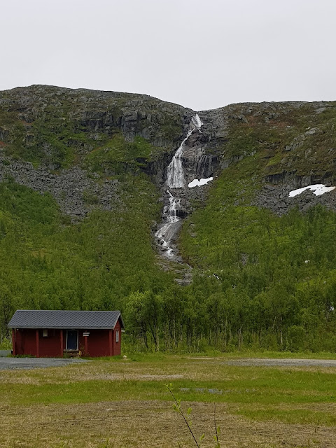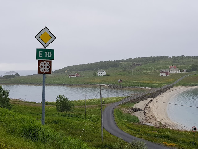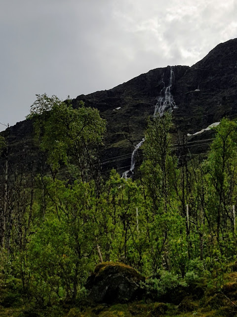 Viitisen tuntia ajettiin Abiskosta Norjan Svolvaeriin, joka kuuluu Lofoottien saariryhmään. Maisemat muuttuivat taas lähes heti rajan jälkeen. Jos Ruotsissa oli kaikki suurta ja huoliteltua, Norjassa kaikki on heppoisen näköistä ja rosoista. Vuoret muuttuivat ensin paljaiksi kallioiksi ja hetken päästä pääsimme mutkittelemaan vuonojen ympärillä. Sääli vaan, kun valtaosa pysähdys ja näköalapaikoista oli metsittynyt umpeen, eikä kuvaamaan oikein päässyt. Matkalla pysähdeltiin kuvaamaan jonkin verran, mutta tihkusade vei enimmät halut nousta autosta. Keittelimme risottoa taukopaikalla, jossa oli toisen maailmansodan muistomerkki. Narvikin ympäristössä sotamuistomerkkejä löytyi jokaisen nurkan takaa. Ajoimme ainakin kahden suuren sillan yli ja lukuisissa tunneleissa, joista pisin oli kuusi kilometriä pitkä! Heti lofoottitien alkaessa tienlaitojen ja maisemien hoitokin muuttui huomattavasti parempaan suuntaan ja oli ilo päästä taas kuvaamaan kauniita maisemia ja vastaan tulevia ihmeitä.