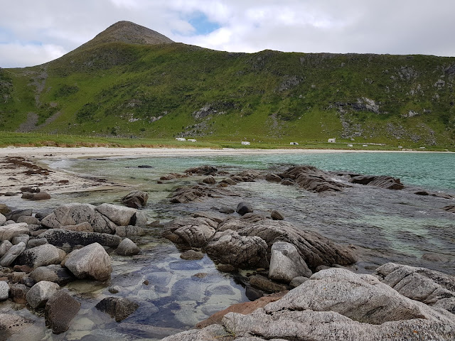 Lopuksi ajelimme läheisille rannoille, Rambergiin ja Skagsandeniin, joista ensimmäistä on verrattu Rio de janeiron hiekkarantoihin. Näky jota ei voi vangita kameralla! Turkoosia vettä, valkeaa hiekkaa, kuun sirppinä kaartuva ranta ja kaiken tämän kehystää uljas lofoottien vuoririvistö. Täältä löydettiin iso simpukankuori, joka päätettiin liittää matkamuistoihin. Käytiin kotimatkalla vielä Rema 1000:sta ostamassa nutellaa ja muita hömpötyksiä. Raunolle olisi ostettu tuomiseksi hieno viikinkilaivalla kuvioitu oluttölkki, mutta ilmeisesti Norjassa alkoholin myynti päättyy tuntia aiemmin kuin Suomessa, kun emme vähän kahdeksan jälkeen saaneet olutta ostettua. Illalla syötiin Niinan tekemiä lettuja nutellan kera! Mukava oli paistella ja mussutella lättyjä leirintäalueen huoltokatoksessa ja nauttia samalla lofoottien kauneudesta. Ei nimittäin ollut hullumpi paikka leiriytyä. Sandvika camping, 10 min päässä Svolvaerista, pienellä rannalla, kauniissa vuorimaisemassa! Ihan täydellistä!