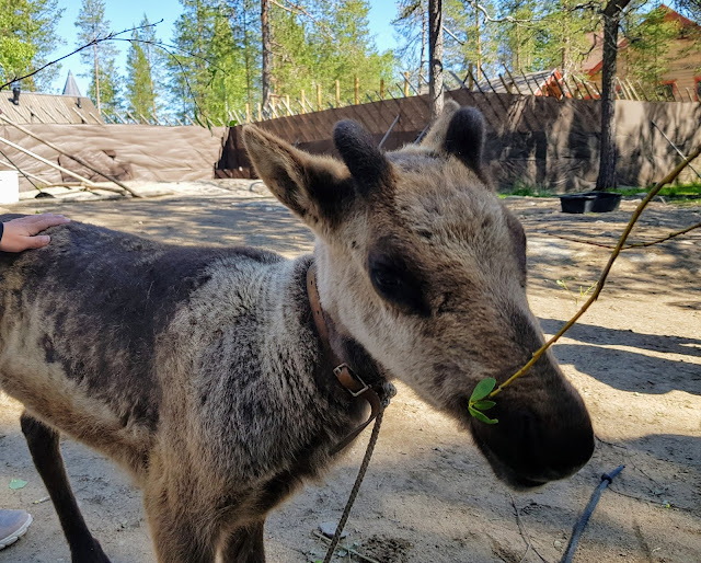 Kiersimme näyttelyn, joka johti meidät tapaamaan joulupukkia. Pukki kyseli, muistavatko tytöt mitä olivat pukilta viime jouluna saaneet ja Sarah teki pukille reklamaation rikki menneestä piirrustustaulustaan. Pukin kanssa olisi saanut ottaa todella kalliin valokuvankin, mutta onneksi tyttöjä jännitti sen verran, ettei kuvaa otettu ollenkaan. Ostimme tytöille vielä viimeiset matkamuistot pukin pajasta/retkeltä. Seuraavaksi piipahdimme pukin pääpostiin. Lähetimme sieltä kortit kotiin napapiirin omalla portileimalla. Viimeiseksi menimme moikkaamaan pukin poroja. Aitauksessa oli kolme upeaa sarvipäistä urosta, sekä emä ja toukokuussa syntynyt vasa. Ihanan söpöjä, ihanan pehmeitä ja ah niin lutusia Petteri Punakuonon kavereita. Syötimme vasalle ja emälle lehtiä puun oksasta ja rapsuttelimme poroja kylliksemme. Sarah halusi kysyä poronhoitajalta, miksi porojen sarvissa oli karvaa. Tämä selvisi ja lähdimme tekemään retkemme viimeistä strangeruokaa alueen paussipöydille. Vielä kuuden tunnin ajo kotiin ja stopit päälle. Olipa upea reissu!
