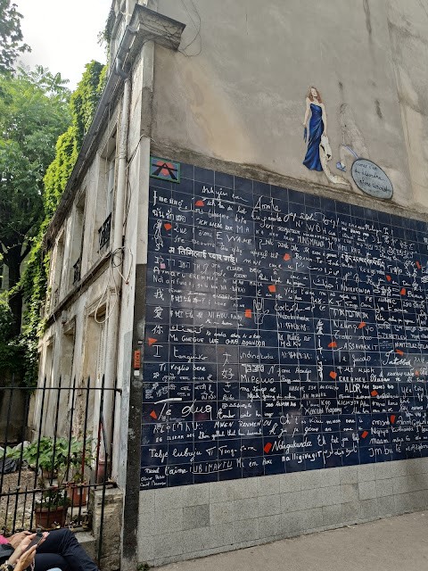 Sitten suuntasimme rakkauden seinälle (Le mur des je t’aime by Frédéric Baronin ja Claire Kliton). Seinä oli sinisistä kaakeleista luotu taideteos, jossa sanat “minä rakastan sinua” on kirjoitettu 250:llä eri kielellä. Savanna sai etsiä seinältä suomalaisen lausahduksen, joka lukemiemme postausten mukaan esiintyy seinällä kahdesti. Paitsi seinä, myös sitä ympäröivä miljöö oli hyvin kaunis. Vanhan rakennuksen seinillä kasvoi köynnöksiä ja sitä suojaamaan oli suunniteltu pieni mutta vehreä puistoalue. Ehdottomasti hyvän mielen kokemus kanssaturisteista huolimatta. Paikalle pääsee etempää myös helposti metrolla, johon johti vanhaa artitehtuuria kunnioittava kaunis metroportti.