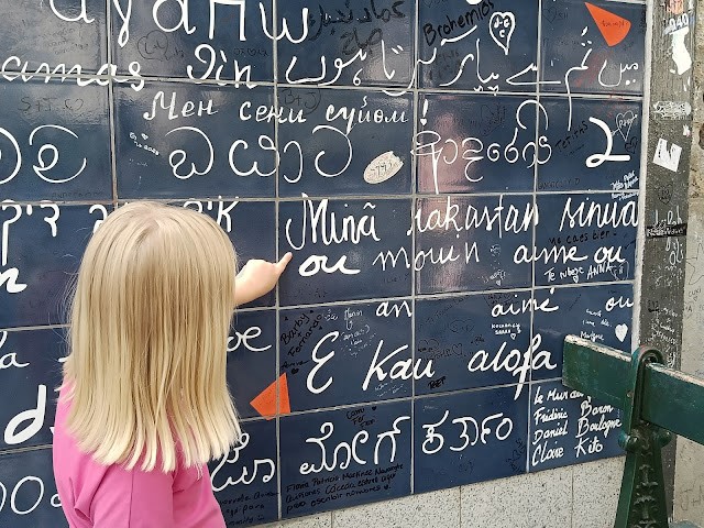 Vailla suurempaa suunnitelmaa tepastelimme alas mäkeä tutustuaksemme alueeseen ja sen tunnelmaan paremmin. Ihailimme kapeita katuja, vanhoja kerrostaloja ja ranskalaisia parvekkeita. Aina välillä eteen sattui pientä koiraa ulkoiluttavia paikallisia, jotka saivat hymyn huulille trimmattuine turkkeineen ja “koiranvaunuineen”. Mukavan paikan tullessa vastaan, istahdimme kadun varteen asetetuille pöydille nauttimaan kahvit ja pientä purtavaa. Ruokalista oli tietenkin ranskaksi, mikä asetti pienen haasteen löytää vähemmän seikkailunhaluisille pienemmille kulinaristeille välipalaa. Lopulta päätimme kokeilla vain jotain summamutikassa metodilla, jos et tykkää, kyllä aikuiset syö. Lopputulos nauratti lapsia, sillä kaiken pohdinnan jälkeen pöydälle asetettiin kulholliset ranskalaisia=) Tunnelma oli mukavan rento ja välitön ja tytöt tuntuivat jaksavan vielä, joten emme kiirehtineet asunnolle, vaan jatkoimme matkaa kohti rakkauden seinää.