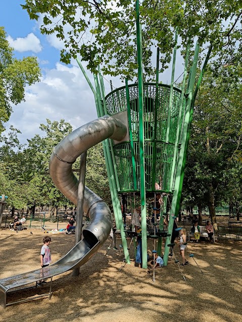 Pienen, kadun varrella popsitun aamiaisen jälkeen nälkä yllätti seikkailijat yllättävän pian. Poikkesimme ravintolaan juustoiselle lounaalle. Rauno tilasi itselleen juustolautasen ja Sarah ja Niina jakoivat fonduepadan. Oli muuten maukas idea kastaa juustoon paistettuja perunoita. Savanna ja Annlisa jakoivat friteeratun kanaleikkeen ja kaikki poistuivat ravintolasta kylläisinä ja hyvillä mielin. Matkalla puistoon poikkesimme pirates karkkikauppaan, jonka namut olivat paitsi herkullisia, myös suuria ja erilaisia kuin kotona. Lisäksi kävimme vastaan tulleessa kirjakaupassa ostamassa itsellemme taiteilijan tarvikkeita Eiffel tornin ikuistamista varten. Itse puisto oli valtava. Istuksimme kastanjapuiden varjossa ja Annlisa harrasti porrasjumppaa päästyään viimein irti vaunuistaan. Keskellä puistoa oli lampi, jossa olisi saanut uittaa veneitä. Tämän jätimme väliin, mutta sen sijaan Sarah pääsi taluttamaan Savannaa ponilla ympäri puistoa! Siinä ponin selässä tuli havaituksi, että suuri puisto sisälsi houkuttelevan näköisen leikkipuiston. Kyllähän sinne piti vielä päästä ennen matkan jatkumista. Pariisissa leikkipuistoja tuntuu olevan vain näissä suurissa puistoissa, mutta ne ovat hienoja ja hyväkuntoisia. Tämä puisto oli elämämme ensimmäinen maksullinen leikkipuisto, mutta huomatessamme sen sisältävän siistit vessat käsitimme asian. Tytöt leikkivät aikansa. Puistossa oli kivasti tekemistä isommillekin lapsille ja meidän tytöille uusia kivoja juttuja, joten aika kului mukavasti kiipeillen ja mäkiä laskien. Hauskuutta riitti, vaikkakin Sarah häpesi silmät päästään Niinan kertoessa paikallisille pikkupojille liukumän “turvaohjeita”, jotka sisälsivät muun muassa tiedon, ettei liukuputken päältä voi hyppiä laskijoiden päälle