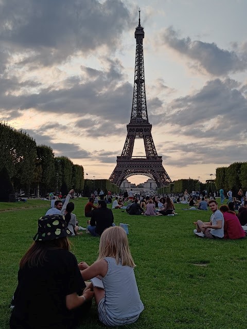 Puistosta lähdimme kävelemään kohti Eifeli tornia. Matkalla ohitimme taas yhden katedraalin, jonka pihalla oli tällä kertaa massiivinen leijonakoristeinen suihkulähde. Lähteestä tuli mieleen, kuinka siistiä ja hyväkuntoista kaikki Pariisissa on ollut. Mielessä on vieläkin Rooman katastrofaalinen epäjärjestys, hoitamattomuus ja epäkunto. Erittäin positiivinen kokemus Pariisi ollut siis tähän asti. Niin ja mukava hetki oli, kun huomasimme, että kyseisen kirkon portailla kuvattiin telkkarisarjaa..pääsimme todistamaan kohtausta, jossa pappi ojensi pojalle kengät=). Ostimme kaupasta vilttieväät Eifelin juurelle, jonne päästäksemme oikaisimme metrolla muutaman mutkan. Sarah pääsi viimein näkemään kauan unelmoimansa Eifel tornin. Söimme eväitä nurmella, ihmettelimme tornia ja ikuistimme siitä omat versiomme uusiin vihkoihimme. Takanamme lauloi ja musisoi etninen musiikkiryhmä. Rauno kävelytti Annlisaa ympäri aluetta muiden taiteillessa. Täydellinen hetki kerta kaikkiaan!