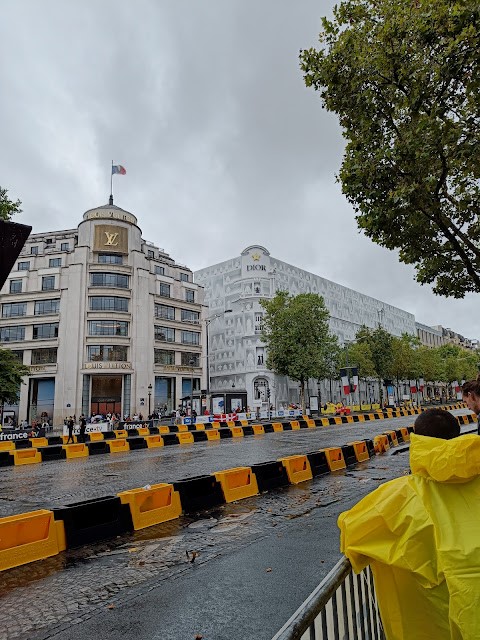 Aamiaisen jälkeen metroilimme riemukaarelle ja pääsimme ihmettelemään, kun koko paikka oli suljettu ja kaikilla pääväylään johtavilla risteyksillä oli turvatarkastukset. Pian kävi ilmi, että olimme osuneet paikalle juuri France tour- pyöräajojen päätöspäivänä, jolloin lähes koko Pariisin keskusta oli suljettu autoilijoilta. Harmaan aamun aikana ihmisiä oli alueella maltillisesti, mutta auringon löytyessä ja päivän edetessä kadunvarsien tarkastuspisteille syntyi jonoja ja pyöräilyreitin varrelle kasaantui tuhansittain katsojia. Aika hieno tunnelma oli, pakko myöntää, vaikka pyöräilystä kilpaurheiluna kukaan meistä ei tiennyt mitään. Iso juttu Ranskassa ja keski- Euroopassa kadun varsien lippujen perusteella selvästikin.