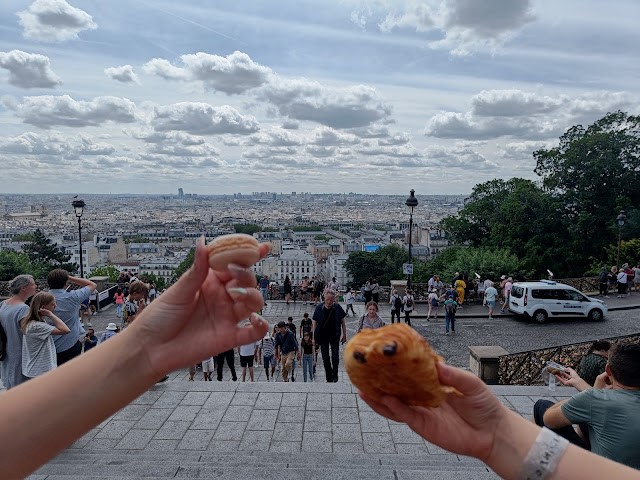 Hyvää huomenta Montmartresta, Pariisin taiteilijakorttelista. Aamu avautui aurinkoisena, mutta ei onneksi helteisenä. Rauno kävi isojen tyttöjen kanssa ostamassa lähikaupoista aamiaistarpeita. Pöytään päätyi mansikka- ja suklaacroisantteja, pistaasi-suklaa kierteitä, ilmakuivattua kinkkua, juustoa ja tuoretta patonkia sekä oliiveja ja jogurtteja. Valtavat kupit kahvia ja kylpy. Sarah sai tekokyntensä ja sitten oltiin valmiina tutustumaan Pariisin kahdeksanteentoista kaupunginosaan. Kipaisimme kaupasta juomatäydennystä. Paikallinen vesijohtovesi on juotavaa, muttei kovinkaan herkullista. Tytöt tykästyivät tuorepuristettuun omenamehuun. Mukaan tarttui myös paikallisia herkkuja Sacré-Cœurin portailla nautittavaksi. Kipusimme katuja pikkuhiljaa ylöspäin kohti valtavaa basilikaa. Annlisa matkasi vaunuissaan Raunon kanssa etsien loivempia reittejä. Me muut kiipesimme lähemmäs parisataa porrasta sivukujia päästäksemme kuvan kauniin ja valtaisan kokoisen kirkon luo. Tämä kannatti, sillä saimme ihailla kirkkoa ensin aivan omassa rauhassamme takavinkkelistä, kunnes kiersimme sen eteen ja saimme ensituntuman Pariisin heinäkuun turremassaan. Kirkon edestä avautui esteetön näkymä yli Pariisin. Ihmettelimme maisemaa ja yllättävän leppoisaa turretunnelmaa kirkon suurilla portailla macaronsseja ja suklaakierteitä syöden sillä aikaa, kun Annlisa veteli sikeitä ja Rauno kävi katsastamassa kirkon rauhallisemman puolen. Pariisia jatkui silmänkantamattomiin. Eiffel torni ei kuitenkaan tälle puolen kirkkokukkulaa näkynyt, joten sen kuvaus jäi vielä tuonnemmaksi