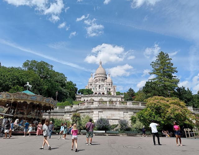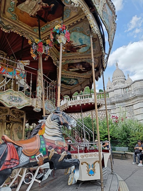 Alas päästyämme vastassamme avautui aukio, jolla oli vanha kaksikerroksinen karuselli. Savanna ja Annlisa pääsivät karusellin kyytiin ja Niinakin siinä siivellä. Aukio oli suoraan basilikan alapuolella ja siltä oli hieno näkymä kirkolle. Isot tytöt viihdyttivät Annlisaa aukion leikkipaikalla ja shoppailivat ensimmäiset Eiffel-aiheiset matkamuistonsa. Aikuiset ihmettelivät aukiota reunustavia kauniita kukkivia puita ja pensaita. Sitten Annlisa päätti jatkaa matkaa ja meidän muiden oli paras seurata perästä. Sarah ja Savanna kävivät kylpyankkakaupassa ja ostivat jotain muutakin mukavaa itselleen.
