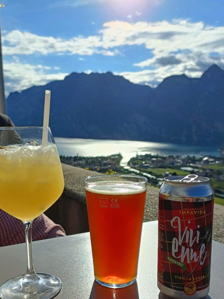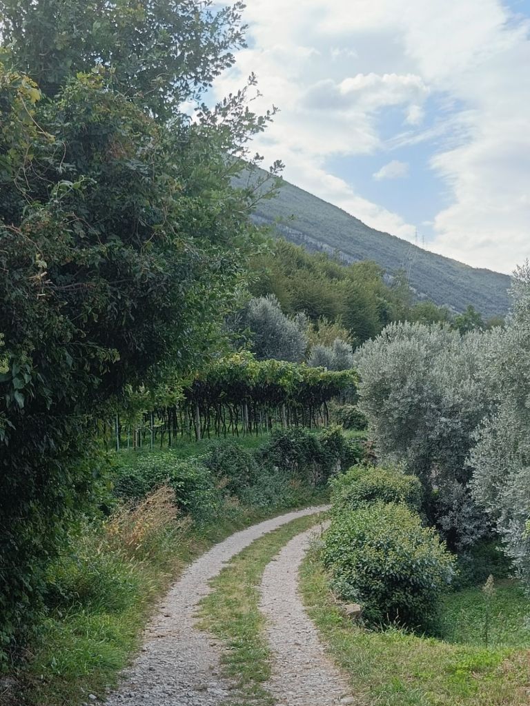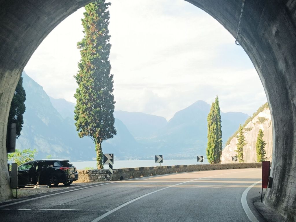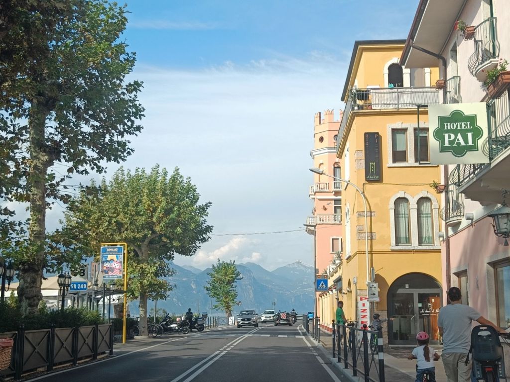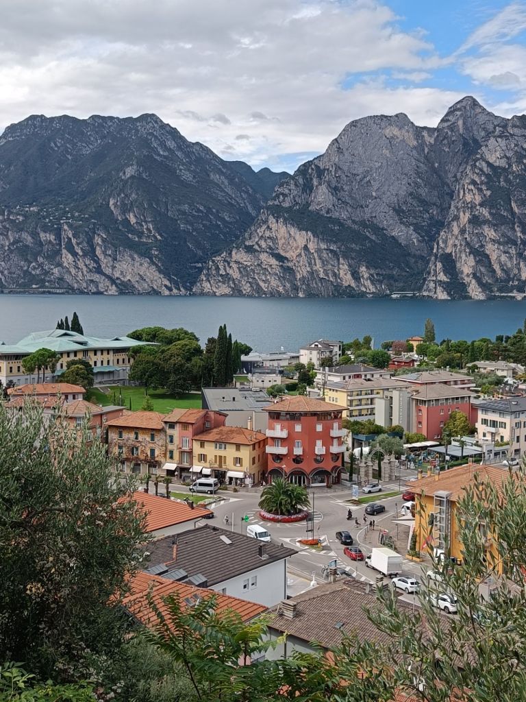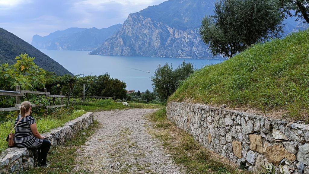 Alas rantaan laskeutuva tie tarjosi huikeat maisemat vuorten ympäröimälle Garda-järvelle! Matkalla ihailimme paitsi veden ja vuoriston kontrastia, myös tietä ympäröivillä rinteillä kasvavia oliiviviljelmiä ja alempana siintäviä viinitarhoja. Nähtiinpä matkalla pienen pieni kolibrikin lentelemässä kukkasissa.