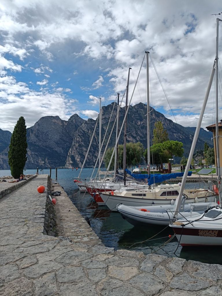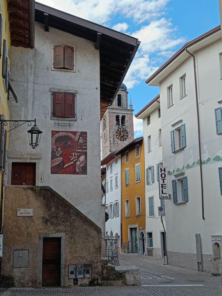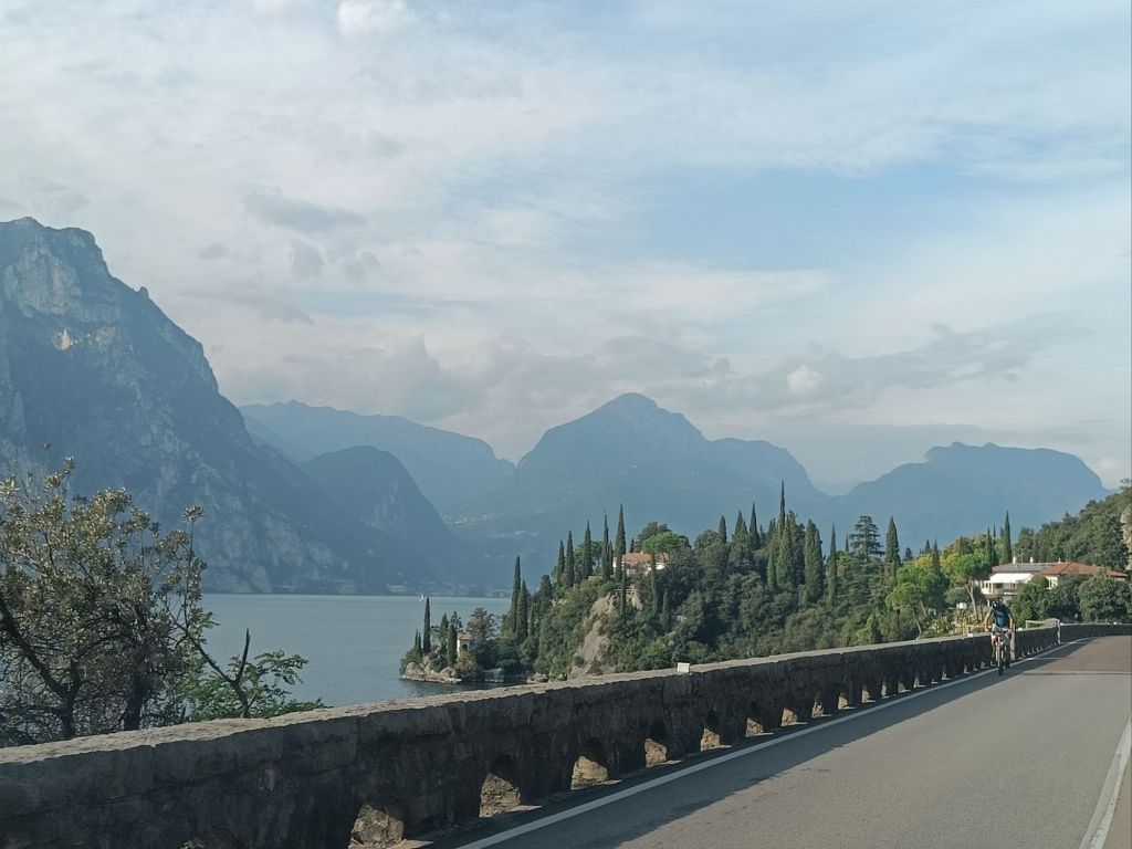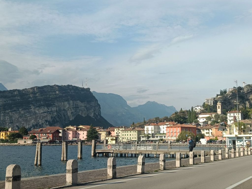 Tiistaina saikin sitten herätä yllätysmaisemiin. Rauno oli ajellut pimeyden poikki hotellille pikkukylään Nago Torboleen. Hauskaa tästä teki se, että Italiassa ei katuvaloja ollut tieosuuksilla muualla kuin tietulleissa, minkä lisäksi navigaattori ohjeisti käännöksissä teiden numeroilla, kun tienviitoissa taasen oli vain katujen nimet. Hotelli ja kylä osoittautuivat aamulla kuitenkin nappivalinnoiksi. Zeniä oli vain maata sängyssä, jossa oli parempi patja kuin kotona ja katsella kattoa, jossa puuverhous täydellisti vanhoja kattoparruja.
