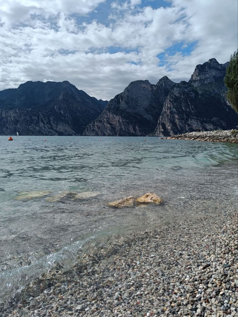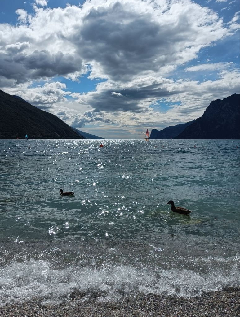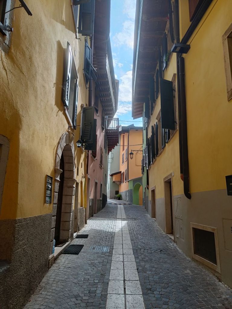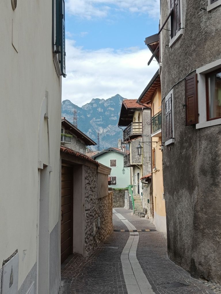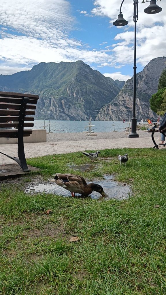 Tiistaina saikin sitten herätä yllätysmaisemiin. Rauno oli ajellut pimeyden poikki hotellille pikkukylään Nago Torboleen. Hauskaa tästä teki se, että Italiassa ei katuvaloja ollut tieosuuksilla muualla kuin tietulleissa, minkä lisäksi navigaattori ohjeisti käännöksissä teiden numeroilla, kun tienviitoissa taasen oli vain katujen nimet. Hotelli ja kylä osoittautuivat aamulla kuitenkin nappivalinnoiksi. Zeniä oli vain maata sängyssä, jossa oli parempi patja kuin kotona ja katsella kattoa, jossa puuverhous täydellisti vanhoja kattoparruja.