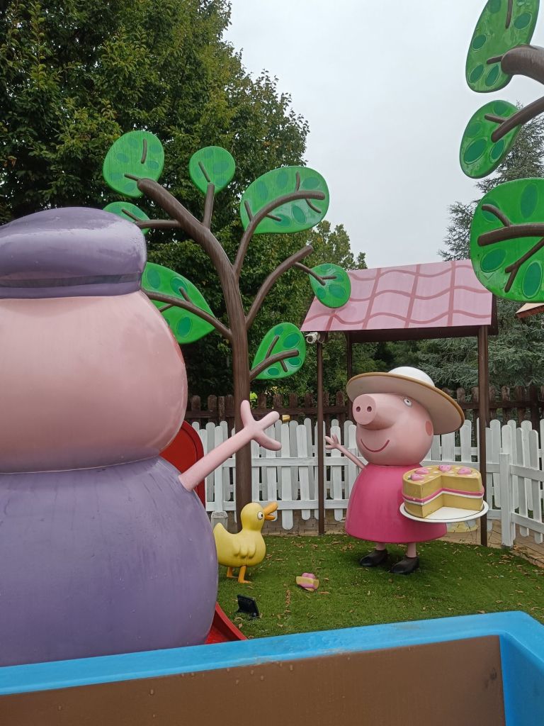 Gardalandiin päästessä taivas oli harmaa ja ensimmäisen tunnin vähän ripeksi. Tämä ei kuitenkaan ilonpitoa haitannut! Alueen pienimmille asiakkaille suunnattu Pipsa Possu maailma oli niin kiva, että siellä piti käydä kahdesti, niin tullessa kuin pois lähtiessä. Annlisa sai uuden Pipsa-uikkarin ja pehmon, Savanna iltoutui ostamaan kaksi pyöreää possutyynyä. Ajeltiin porukalla ukki possun veneillä ja junalla ja vielä Pipsan kuumailmapalloilla. Ylhäältä oli hyvä näkymä poistoon ja sen maamerkkinä olevaan upeaan satupuuhun.