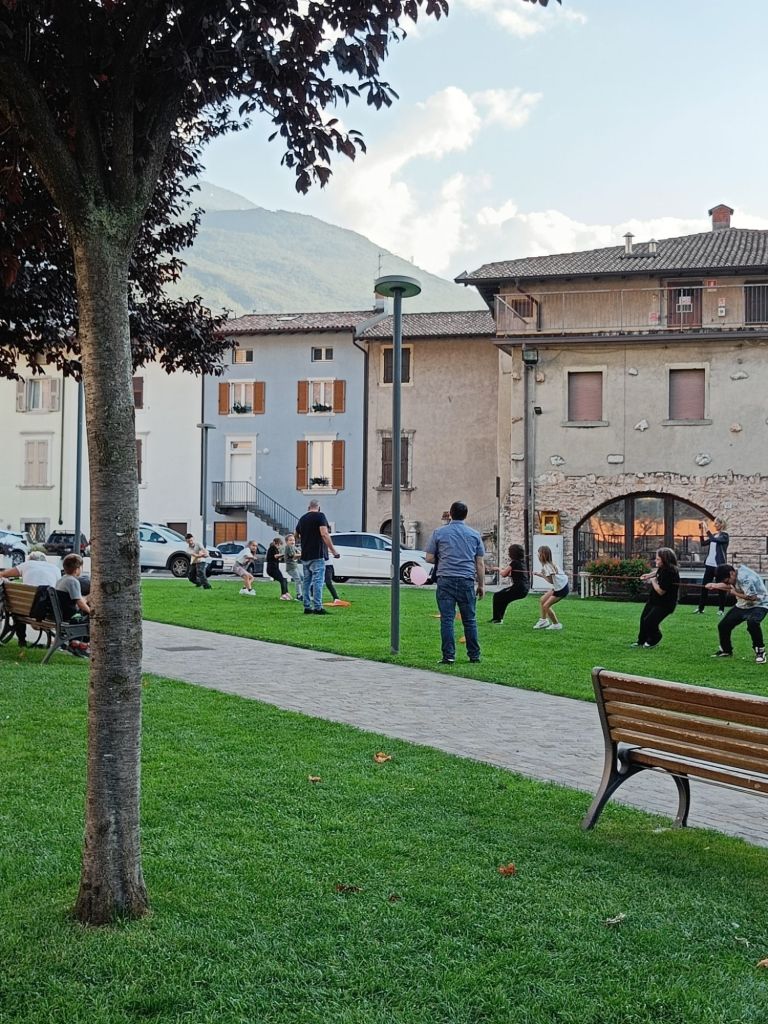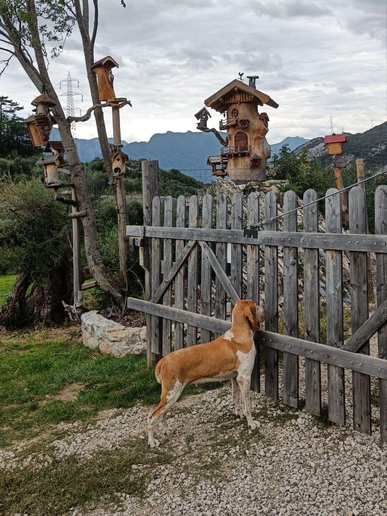 Tänään päivä oli lähes luvattoman kuuma. Auton mittari näytti 26 astetta ja aurinko helotti aamupäivän kirkkaalta taivaalta. Vuoristossa aurinko voi olla kavala, mikä tarkoitti ensimmäisten vastaan tulevien hattujen ostoa Niinalle ja Savalle. Eilisen ajelun jälkeen päätimme minimoida päivän ajot ja suuntasimme naapurikaupunkiin Riva de Gardaan, josta Rauno oli löytänyt vesiputoukset nettiä selattuaan. Auton parkkiin saaminen on täällä aina vähän tuuripeliä. Tänään parkki löytyi erään ravintolan takaa viiniköynnösten alta. Pihalla oli kukko kanoineen, joita Annlisa ihmetteli muiden tutkiessa ympäristöä.