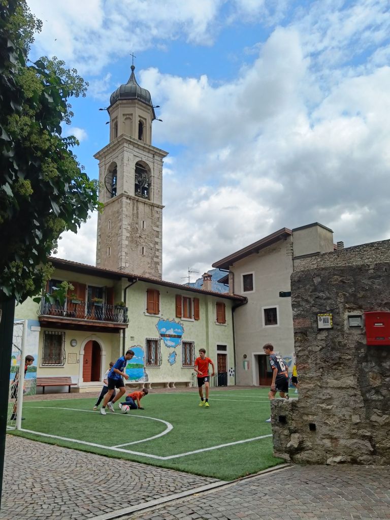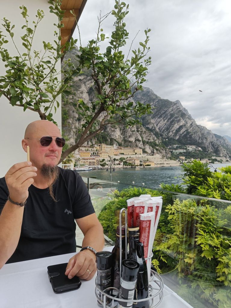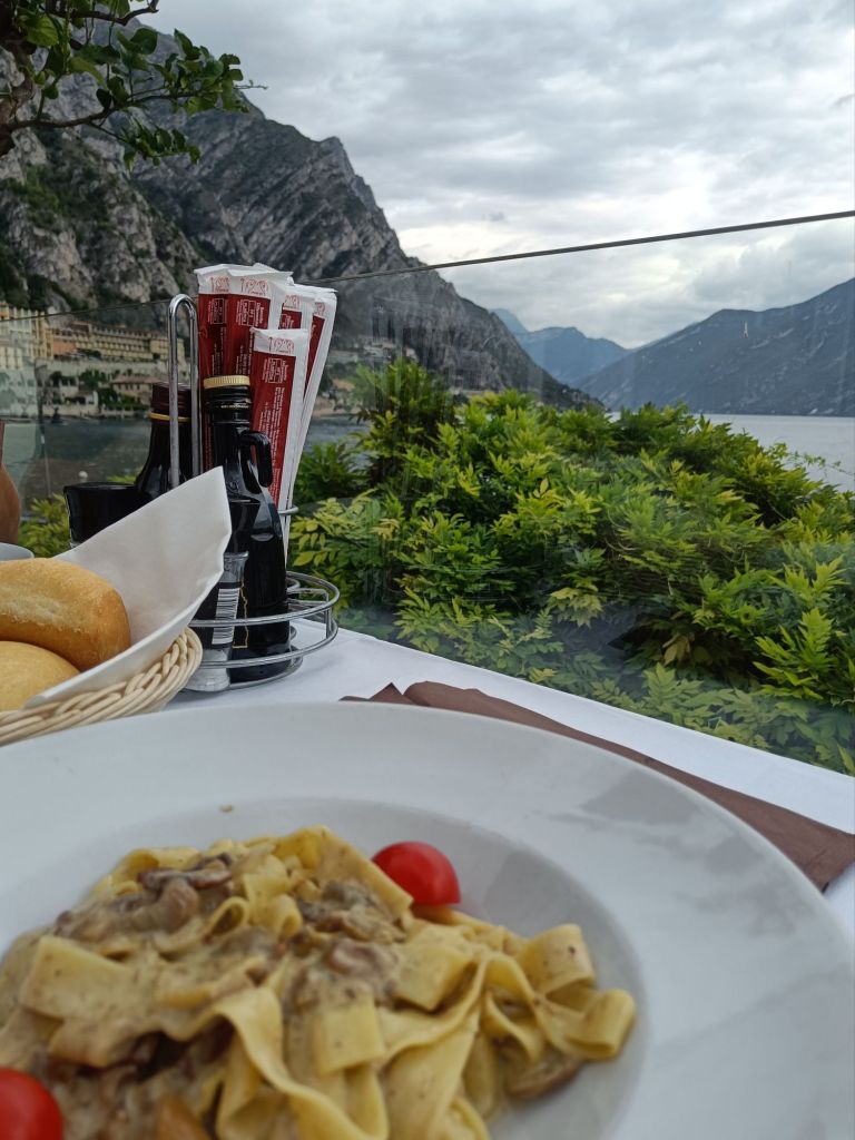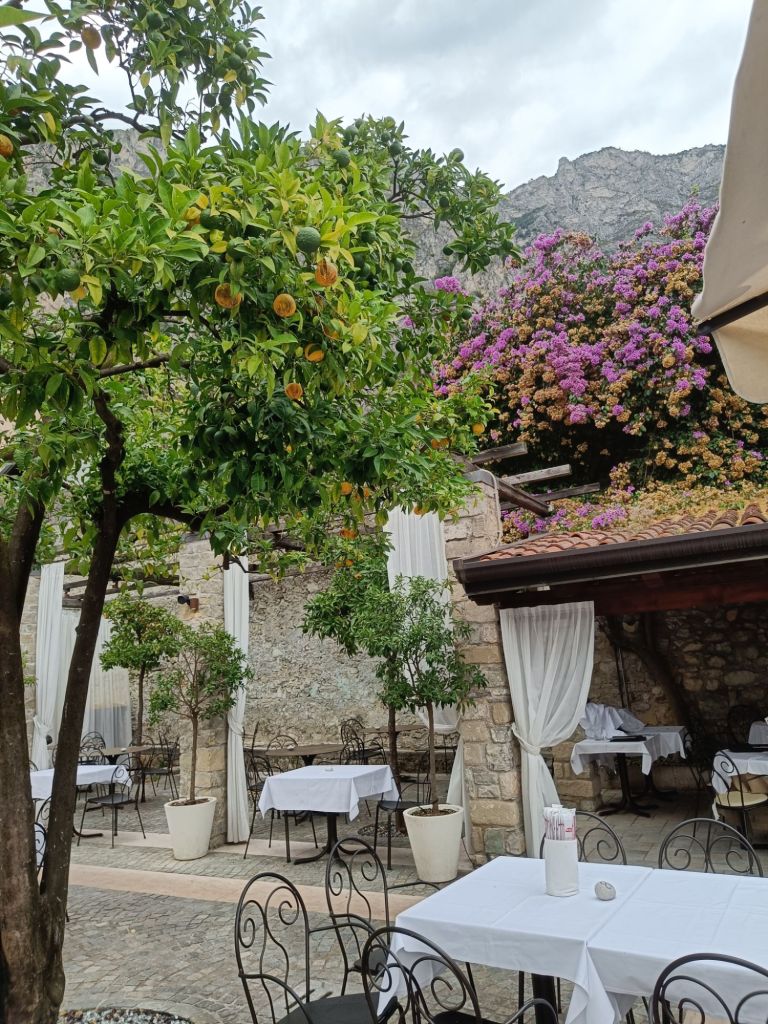 Autolla ajeltiin eri suuntaan järveä kuin eilen. Reitti oli hyvin erilainen. Tie kulki vuoren reunaa ja sujahti lukuisten tunnelien läpi. Alkumatkasta ajelimme Riva de Gardan läpi todeten sen ihan kivan kokoiseksi kaupungiksi, jolla ei ollut mitään silmään pistävää erityispiirrettä. Limone sen sijaan lämmitti mieliä. Pienehkö kylä jyrkällä rinteellä rajoittuen tietenkin rantaan. Kapeat kujat, mukulakivikadut ja nimensä mukaisesti sitrusta siellä ja lisää täällä. Rakennukset olivat kauniita ja kaikki niin siistiä (ihan niinkuin koko pohjois Italiassa on ollut). Kirkon takapihalla oli futiskenttä. Oli mukava vain kävellä ja tuumailla olisiko pastan vai risoton vuoro.