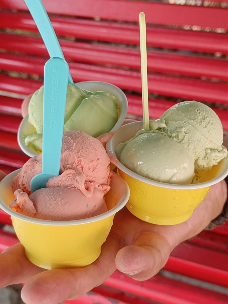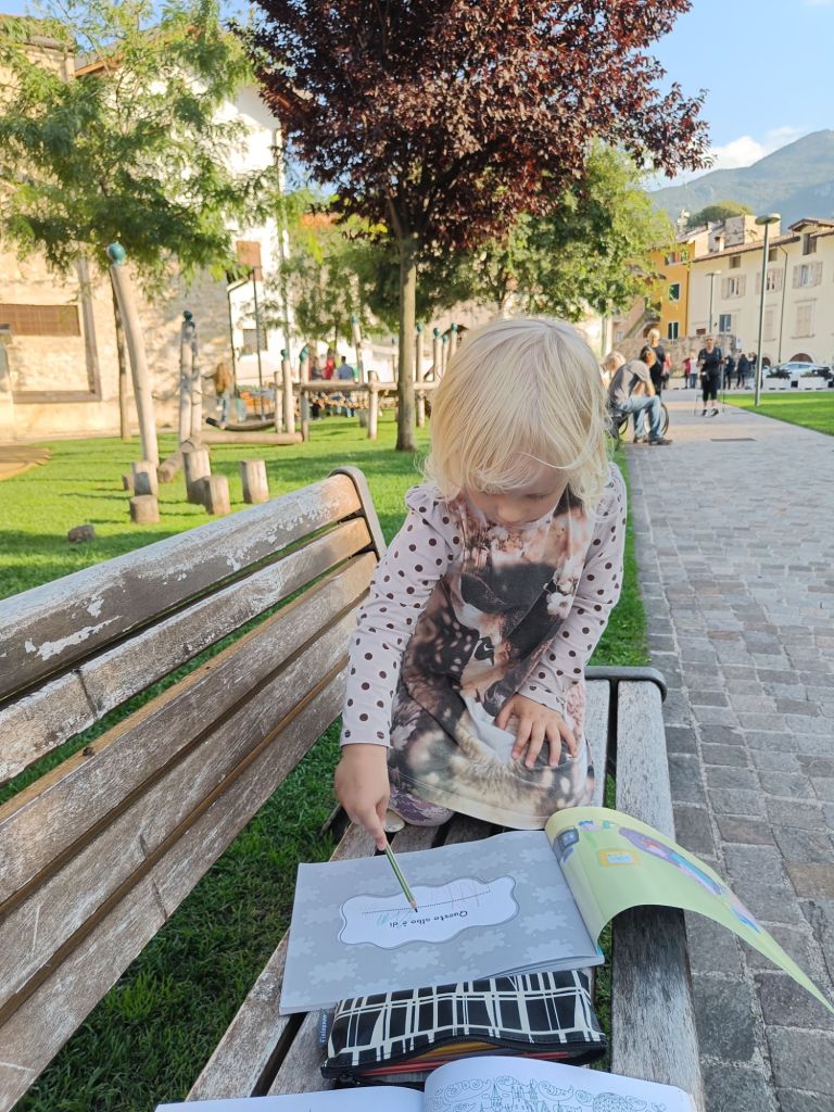 Muksut jaksoivat kyllä upeasti kävellä koko pitkän päivän! Tätä palkittiin gelatolla, joka oli paitsi hyvää, myös super söpöä. Herkut nassuteltiin hauskan isolehtisen puun alla samalla kun lepuuteltiin jalkoja. Ainiin…ja ruoasta puheen ollen. Aiemmin söimme tomaatti-basilika spagetti, frottipottuja sekä kaksia erilaisia gnotseja hyvällä menestyksellä. Ruoka maistui nimittäin kaikille ja gnotsien juustokastikkeet pääsivät “herkkujen herkku” top 10 listalle.