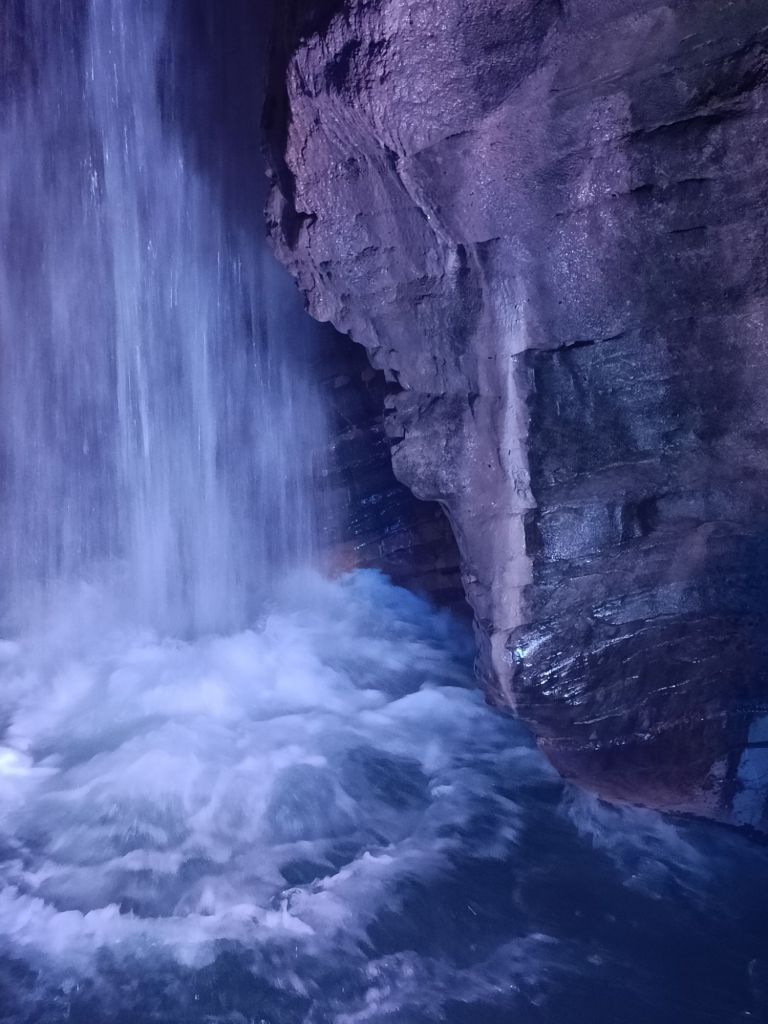 Puutarhassa kuului rentouttava luonnon musiikki, luolassa pauhasi mahtava veden ääni. Ulkona paistoi aurinko, sisällä pimeyden taittoi putouksiin ja kallionseiniin heijastetut väriä vaihtavat valot. Maaginen kokemus! Tätä olisi voinut seurata vaikka kuinka kauan välittämättä vaatteitten kastumisesta. Myös tytöt olivat haltioissaan! Kompakti ja erittäin siisti paikka. Tänne kannattaa piipahtaa kulmilla ollessaan!
