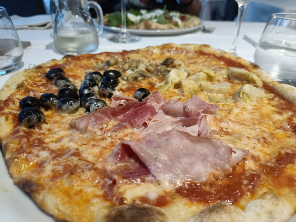 Herkkuaamiaisella päästiin sitten kertaheitolla Italian makuun. Juustoja, makkaroita, hilloja, valtava lajitelma erilaisia makeita jälkiruokia ja tietenkin täydellistä vahvaa kahvia! Käytiin kurkkaamassa allasalue ja todettiin se kauniiksi. Samalla tutustuttiin läheisen kirkon tms kellon kuminaan, joka päiväaikaan nähtävästi kertoo paitsi tasatunnit, myös kellonajan. Pienet lähtövalmistelut ja pihalle tutkimaan ympäristöä. Ja kuinkas ollakkaan, jalat vei suoraan kohden vettä.